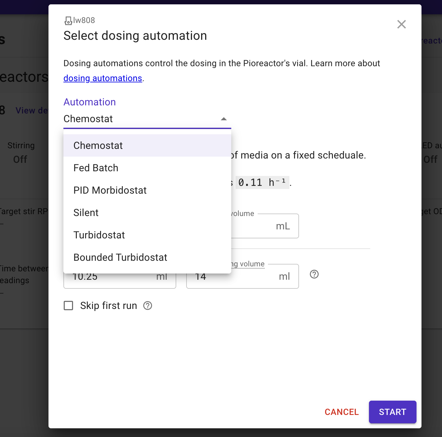 You can also manually add and remove media using the āDosingā tab under āControlā dialog on the Pioreactors page. Carefully add and remove media until youāre back under 1.0.