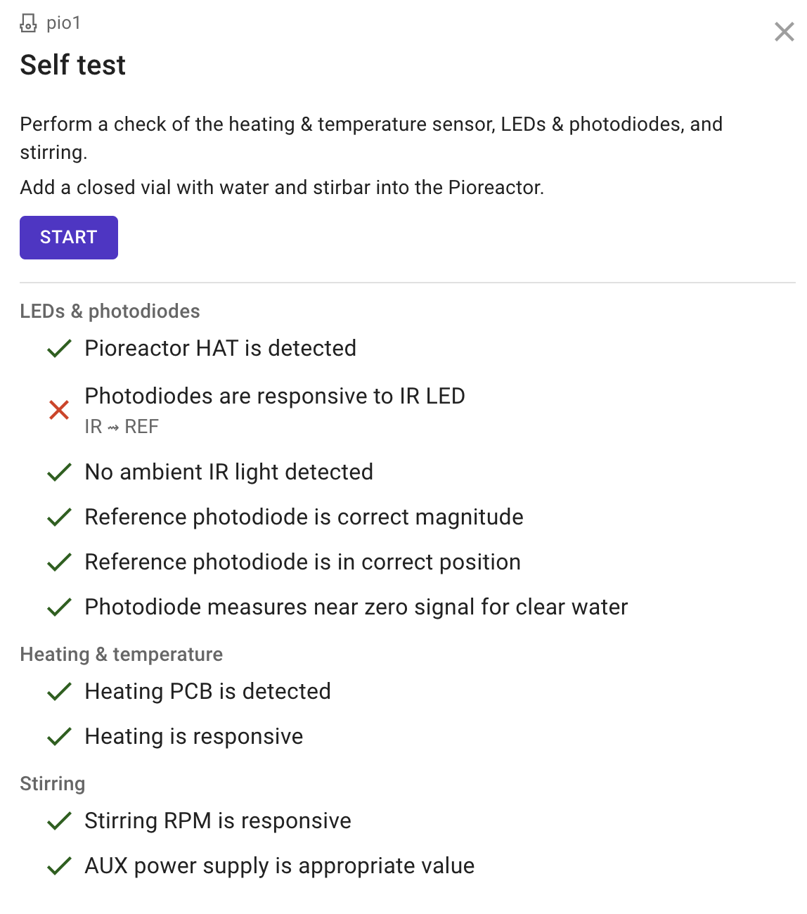 RPM correlation not high enough: ([36.0, 34.5, 33.0, 31.5, 30.0, 28.5, 27.0, 25.5], [0.0, 0.0, 652.7621233556599, 806.364275115039, 755.2857653632436, 690.3322915398992, 620.9668134315133, 556.1104649286694]) Traceback (most recent call last): File /usr/local/lib/python3.11/dist-packages/pioreactor/actions/self_test.py, line 441, in _run test(client, logger, unit, testing_experiment) File /usr/local/lib/python3.11/dist-packages/pioreactor/actions/self_test.py, line 416, in test_positive_correlation_between_rpm_and_stirring assert measured_correlation > 0.9, fRPM correlation not high enough: {(dcs, measured_rpms)} ^^^^^^^^^^^^^^^^^^^^^^^^^^ AssertionError: RPM correlation not high enough: ([36.0, 34.5, 33.0, 31.5, 30.0, 28.5, 27.0, 25.5], [0.0, 0.0, 652.7621233556599, 806.364275115039, 755.2857653632436, 690.3322915398992, 620.9668134315133, 556.1104649286694]) |