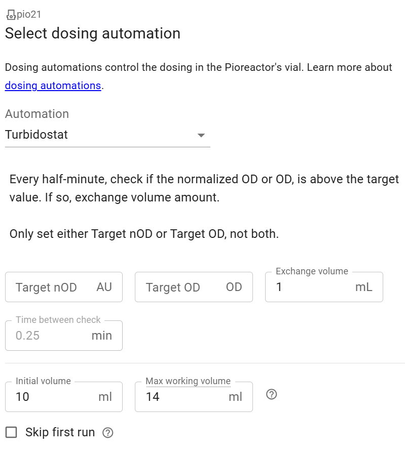 I couldn’t find any more formal instructions on how to write the code. As I understand it “exchange_volume_mL” is the total amount of media Turbidostat can add to the vail to achieve target OD.