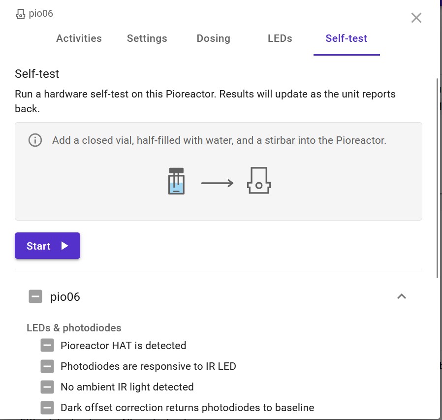 This problem started when I ran a self-test on pio06, where I accidentally pressed the self-test button twice, resulting in most of the jobs (such as temperature control, starting OD readings etc) to stop appearing. At the same time, the self-tests keep flashing between the “-” and check mark which indicates that a self-test was passed. This only occurs in pio06 though and the bug is still there even after reflashing the SD card.